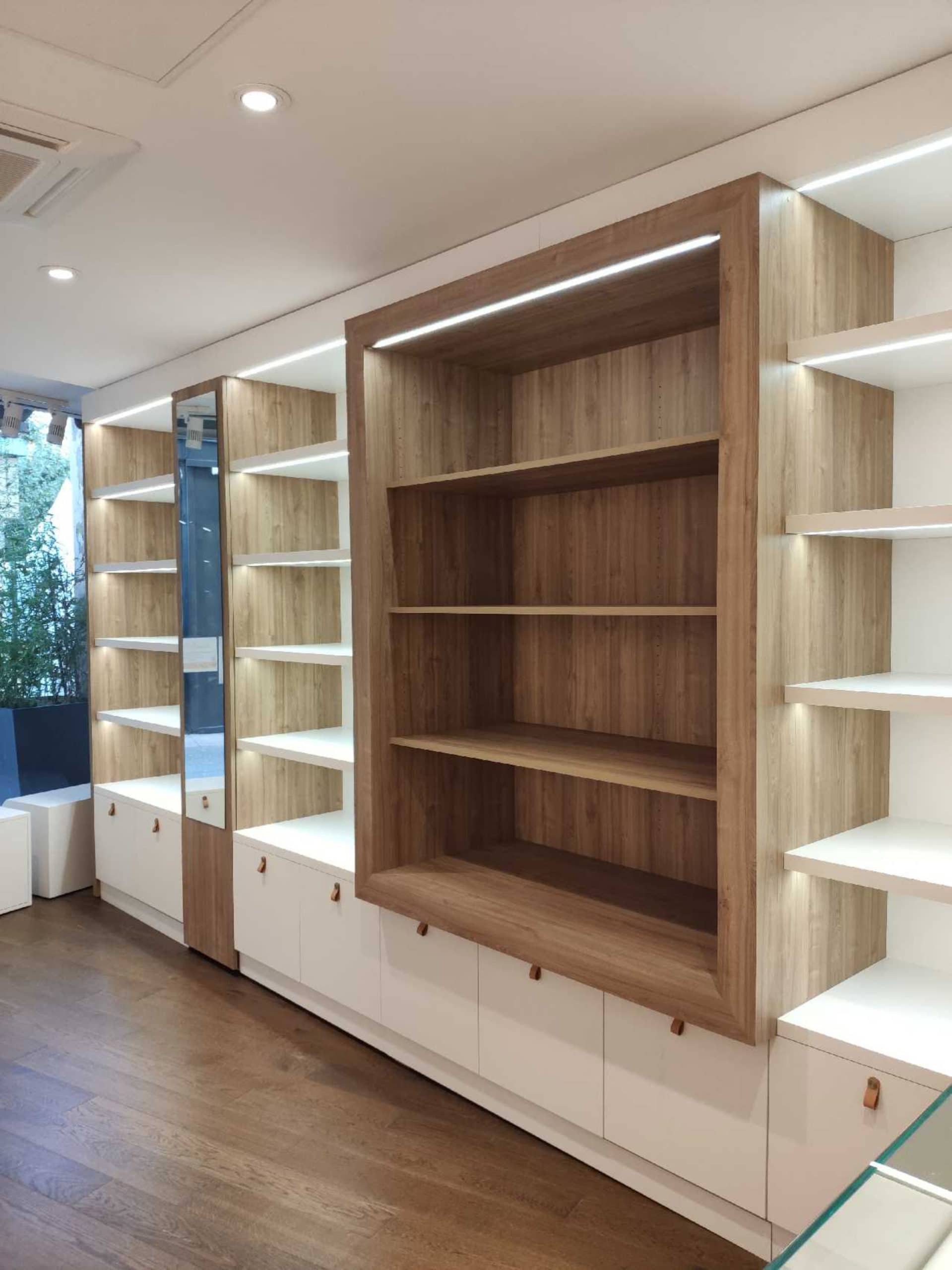 Agencement d’une boutique en plein centre-ville de Valence dans un local tout en longueur et aux murs biscornus ! Rien ne nous fait peur !!! Après un relevé de côtes précis, nous avons proposé à notre client un projet avec une identité forte, effaçant toutes les irrégularités du local, et un design permettant de casser l’effet de longueur. Le choix des grands cadres en bois permet de mettre en valeur les produits et de rythmer le linéaire.